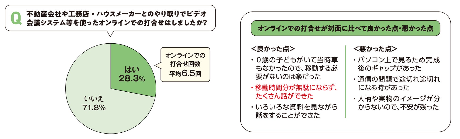 不動産会社や工務店・ハウスメーカーとのやり取りでビデオ会議システム等を使ったオンラインでの打合せをしたか聞いたところ、28.3%が経験していました。オンラインでの打合せ回数は平均6.5回でした。オンラインの打合せ経験者からは「移動時間分が無駄にならずたくさん話ができた」という声が上がりました。