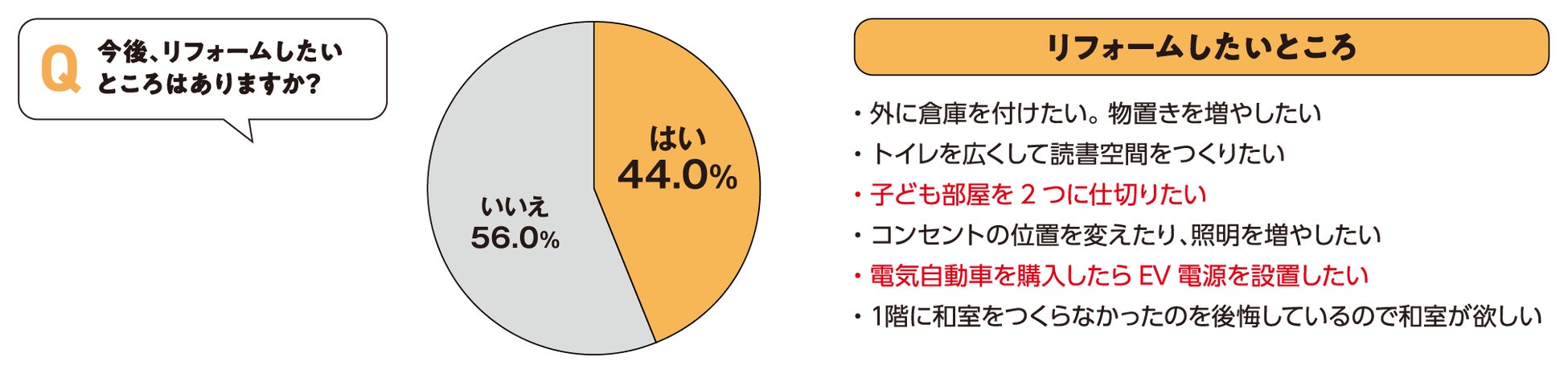 今後リフォームしたいところがあるか聞いたところ、44.0%が「はい」と回答しました。リフォームしたいところは「子ども部屋を2つに仕切りたい」「電気自動車を購入したらEV電源を設置したい」などさまざまでした。