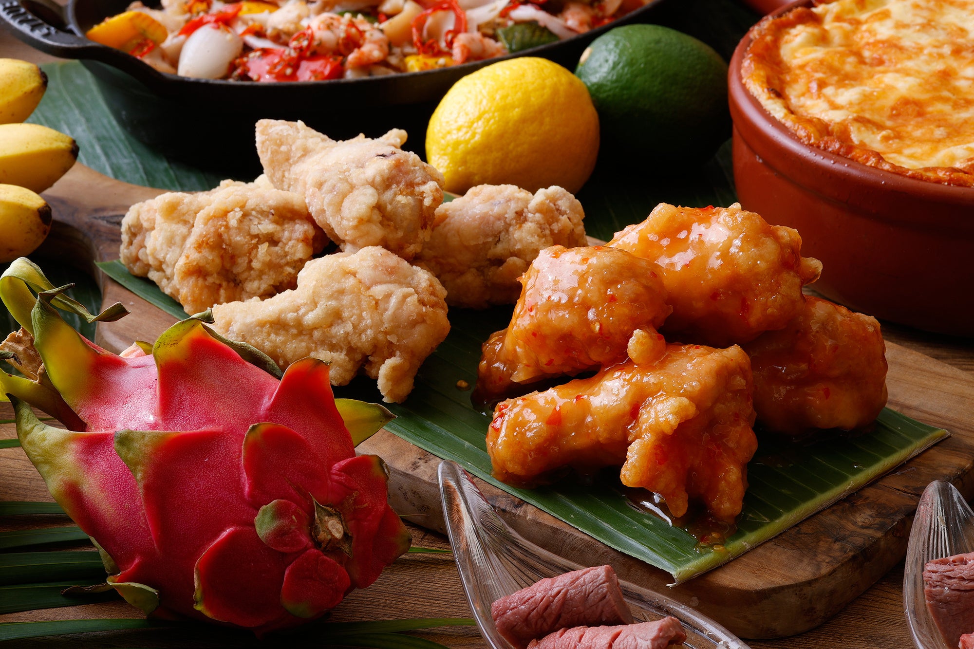 ブッフェの始まりはおもてなしの一品、「バジル香るエビとトマトのムースを添えたガスパッチョ」をお席にご用意いたします。サラダコーナーには色とりどりのガーデニングサラダや、ライムが香るローストチキンと夏野菜のチョップサラダなどが5種類、冷前菜にはスパイシー大豆ミートのナチョスや牛肉に青パパイヤを添えた夏らしい料理が並びます。温製料理コーナーにはシーフードと夏野菜のアヒージョやシーフードのパエリアなどバーベキューを盛り上げる料理をラインナップ。メインのお肉料理はアメリカンバーベキューには欠かせない豚バラ肉や骨付き豚ロースのロースト、シェフの遊び心溢れる韓国チキン風の手羽元から揚げなど様々なお肉料理にフィーチャーいたしました。ヘルシー・ビューティー・フレッシュのコンセプトのもと、高タンパクで栄養満点なお肉料理とビタミンたっぷりの夏野菜を使用したシェフのアイデアが光るメニューの数々をお楽しみいただけます。