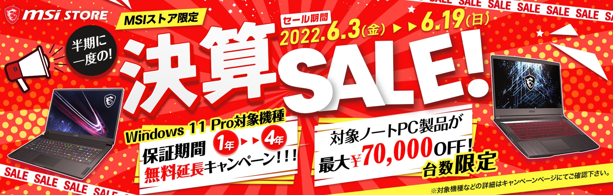 『MSIストア 決算SALE!』では対象のWindows 11 Pro搭載製品の製品保証が通常お買い上げ日より1年間のところ、4年間に延長される「保証期間無料延長キャンペーン!!!」を実施。さらに、対象ノートPCが最大70,000円OFFになる「台数限定セール」も実施いたします。