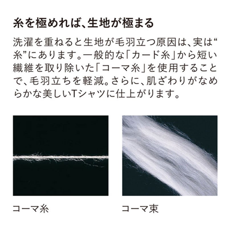 首リブの強度を保つ「ダブルステッチ」や毛羽立ちを抑える「コーマ糸」の採用。