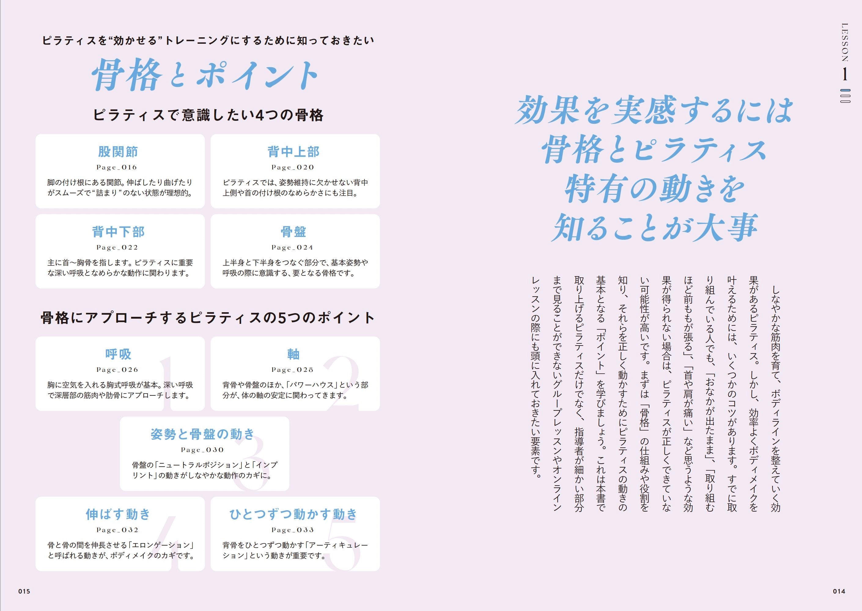 本書ではピラティスを行う上で覚えておきたい基本中の基本から紹介します。筋肉への効果を出すためには骨格とピラティス特有の動きを知ることが大事になります。骨格の仕組みや役割を知り、それらを正しく動かすポイントを抑えることで効率的にボディメイクをかなえることができます。