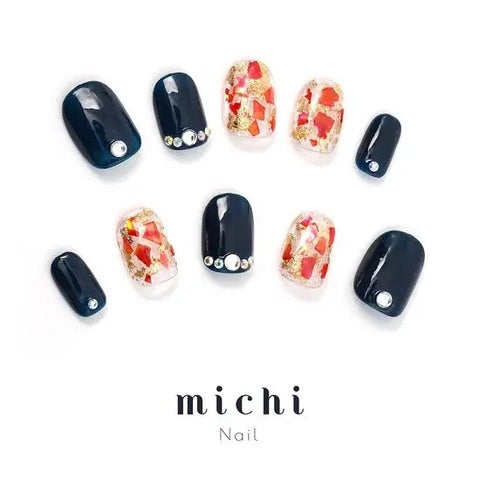深みのあるネイビーとクリアのコントラストに、金箔と赤のシェルがよく映えるお洒落な組み合わせです。