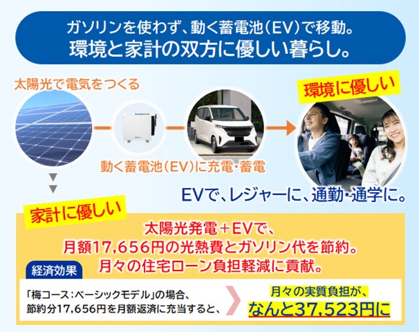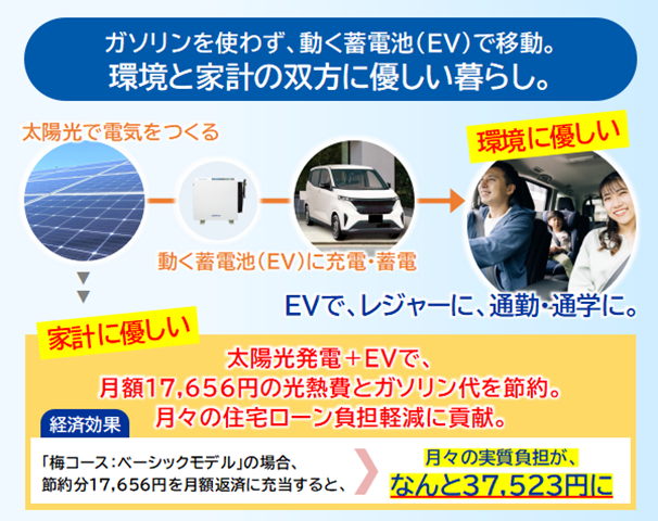 動く蓄電池(EV)、太陽光発電システム、V2Hを標準装備することで、環境にも配慮し、かつ災害に対応する❝自給自足の生活❞を実現、持続可能な社会へ向けた、地球環境に優しい次世代の暮らしをご提案いたします。