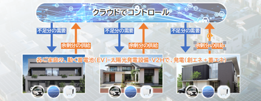 経済産業省が推進する、家で発電した電気を電気が⾜りない家庭に直接供給できるVPP(バーチャル・パワー・プラント)社会は、すぐそこまで迫っています。⼀⼾建てで電気を融通・有効活⽤し、スマートハウス1,000 棟分のネットワークで⼩型の⽔⼒発電所1基分を賄うことができます。