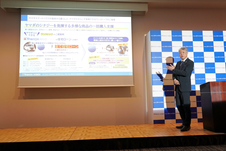 ▲10 ⽉26 ⽇ 都内にて発表会を開催、スマートハウスを紹介する代表取締役兼社⻑執⾏役員 清村浩⼀