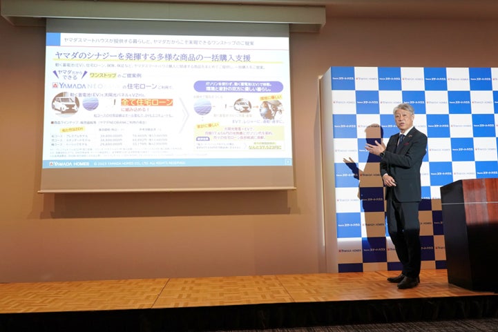 株式会社ヤマダホームズ(本社︓群⾺県⾼崎市、代表取締役兼社⻑執⾏役員︓清村浩⼀、以下 ヤマダホームズ)は、動く蓄電池(EV)を標準搭載し、太陽光発電システム、V2H、IoT システムを使って「創エネ・蓄エネ・省エネ+エンタメ・健康・セキュリティ、そして繋がるIoT」を実現する近未来スタンダード住宅「YAMADA スマートハウス」を、2023 年10 ⽉14 ⽇(⼟)より販売を開始しました。家電、家具はもちろん、リフォーム、⾦融、動く蓄電池(EV)に⾄るまで住空間全てのインフラをラインナップしたヤマダホールディングスグループのシナジーを最⼤化した究極スマートハウスが誕⽣しました。