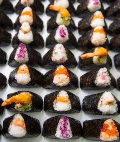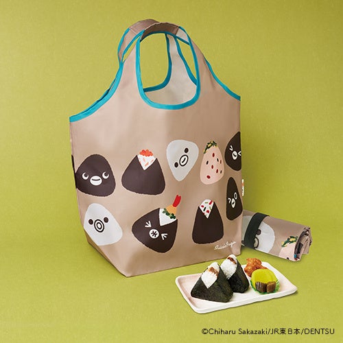販売概要:キュートなおむすびがコロコロしたデザインのオリジナルエコバッグに、おむすび2つと唐揚げ、お漬物がついたセットです。
