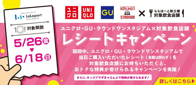 ユニクロ・GU・ラウンドワン(カラオケ・スポッチャのみ)の期間中のレシートを対象飲食店舗にお持ちいただくとオトクな特典が受けられるキャンペーンを開催!さらにキッズプラザきゃらんどでも特典をご用意しております。