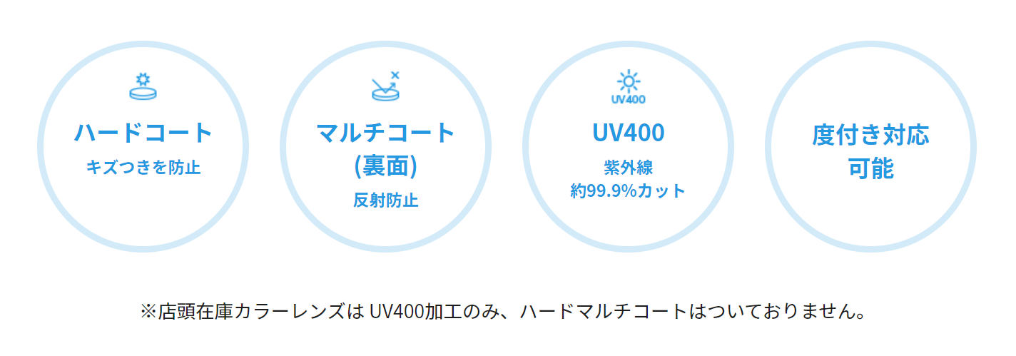 【対象商品】カラーレンズ、色の変わるレンズ(調光レンズ)、偏光レンズ、UVクリアレンズ、イエローライトカットレンズ、ミラーレンズ、遠近両用カラーレンズ