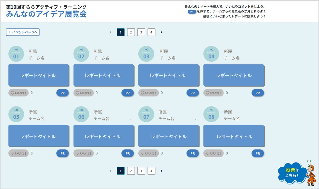 ①参加者は、各出展チームのレポートと各チームの意気込みを表したPR(画像・動画・テキストのいずれか)の閲覧が可能。