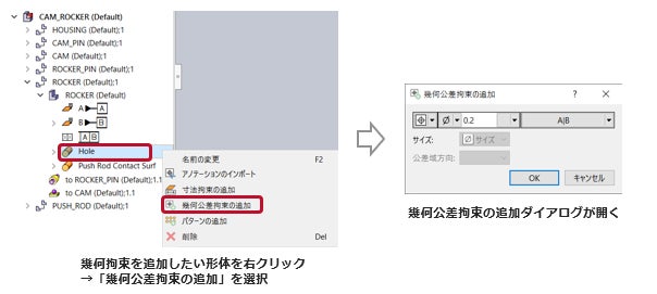 従来はリボンアイコンから操作していた「幾何公差拘束の追加」機能が、形体のコンテキストメニューにも追加されました。設定をより直感的に行えるようになり、作業効率が向上します。