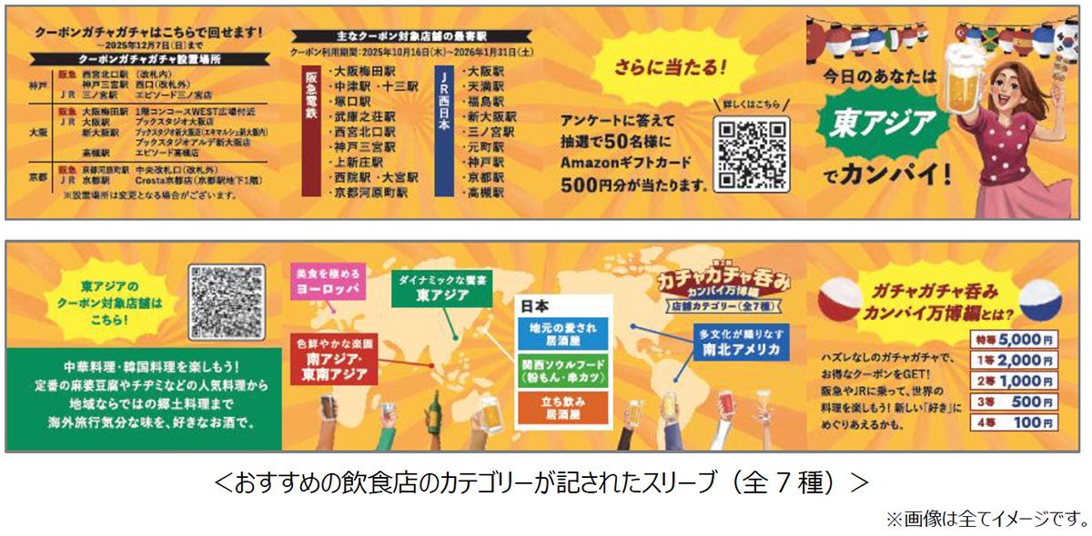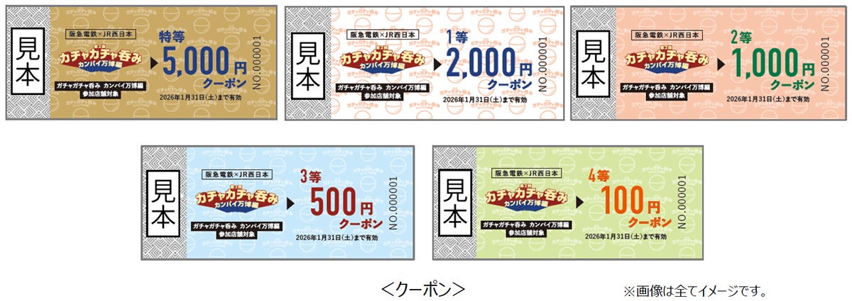 阪急電鉄株式会社(以下、阪急電鉄)と西日本旅客鉄道株式会社(以下、JR西日本)では、両社沿線の飲食店で利用できるクーポンが当たる「ガチャガチャ呑み カンパイ万博編」を開催します。