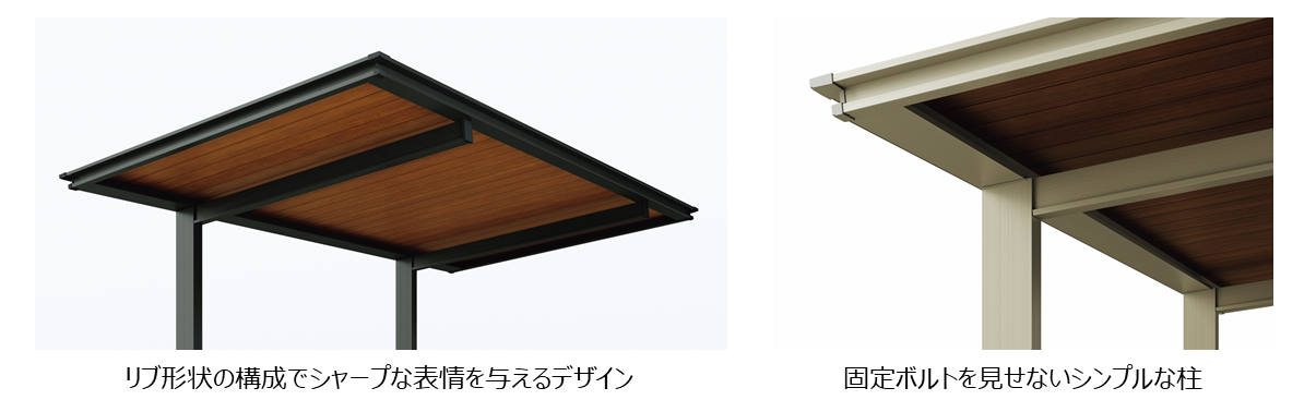 各部をリブ形状で構成。シャープな表情を与えるデザイン、梁から浮かせて見せることで軽快な印象を演出する屋根部、従来品では露出していた雨どいやジョイント材の固定ボルトを見せない工夫など、“堅牢さ”や“重厚感”を想起させる表情豊かなディテールがラグジュアリーな印象を与え、空間全体の上質感を高めます。