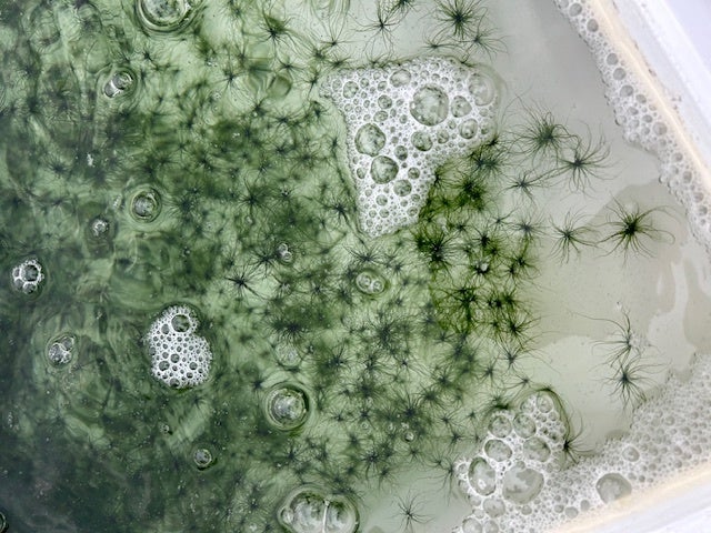 スジアオノリの陸上養殖技術は、かつて河川流域での収穫が盛んだった徳島県と高知県で実用化が研究されました。徳島の吉野川汽水域ではかつて年間100tの収量がありましたが、気候変動やダム建設などの影響を受け17t程に減少しています。徳島の鳴門わかめを取り扱う阿波市場は、スジアオノリの食文化を次世代につなぐため、わかめの種苗作りで連携する高知大学と協力し養殖の研究に着手しました。