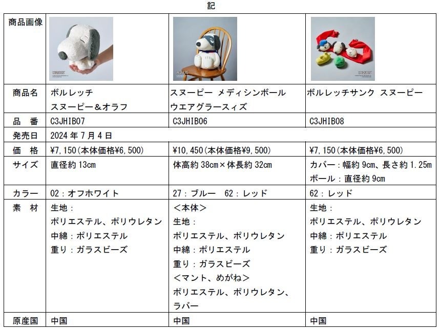 今回のアイテムは、肩や二の腕、背中をほぐすことができる約500gのダンベルボール「ボルレッチ スヌーピー&オラフ」、好みの重さで肩・首まわりのストレッチなどができる「ボルレッチサンク スヌーピー」、2 kgの重さで体幹を鍛えることができるスヌーピーの形をした「スヌーピー メディシンボール ウエアグラースィズ」です。