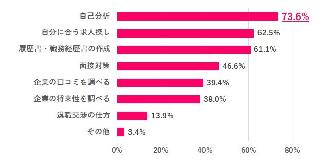 Q.6で「使ってみたい」「既に使っている」と答えた方にどのような用途でChatGPTを使ってみたいか(使っているか)を尋ねたところ、1位は「自己分析」73.6%、2位「自分に合う求人探し」62.5%、3位「履歴書・職務経歴書の作成」61.1%と続きました。面接対策や退職交渉など、転職活動の中盤以降の行程での利用意向より、自己分析や自分に合う求人探しなど、始めの段階での利用意向が高い様子が見て取れました。