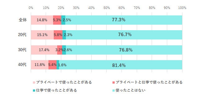 ChatGPTの使用経験について尋ねると、「使ったことはない」が最も多く77.3%でした。次いで「プライベートで使ったことがある」14.8%、「プライベートと仕事で使ったことがある」5.3%、「仕事で使ったことがある」2.5%と続きました。年代別に見てみると、20代、30代は使ったことがある人がほぼ同数で、40代になると「使ったことはない」人の割合が増える傾向がありました。