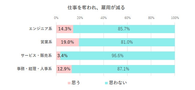 一方、3位の「仕事を奪われ、雇用が減る」というネガティブな影響をイメージしている人の割合が多い職種は、営業系が1位で19.0%、次いでエンジニア系14.3%、事務・経理・人事系12.9%、サービス・販売系3.4%と続きました。仕事を奪われるという危機感を持っているのは、営業系が最も多く、サービス・販売系が最も低いという結果でした。