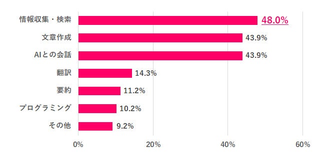 Q.2で「使ったことがある」と答えた人に、どのようなことに使ったかを尋ねると、1位「情報収集・検索」48.0%、2位は「文章作成」と「AIとの会話」が同率で43.9%でした。