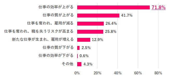Q.4で仕事に影響があると思うと答えた人にどのような影響があると思うかを尋ねると、1位「仕事の効率が上がる」71.8%、2位「仕事の質が上がる」41.7%となり、ポジティブな影響をイメージしている人の方が多い結果です。