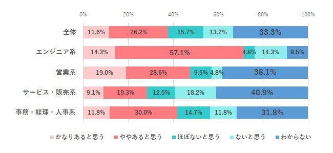 また、主な職種別に見てみると、影響が「かなりあると思う」「ややあると思う」と回答した人は、エンジニア系が最も多く71.4%に上り、サービス販売系については28.4%と最も低くなりました。