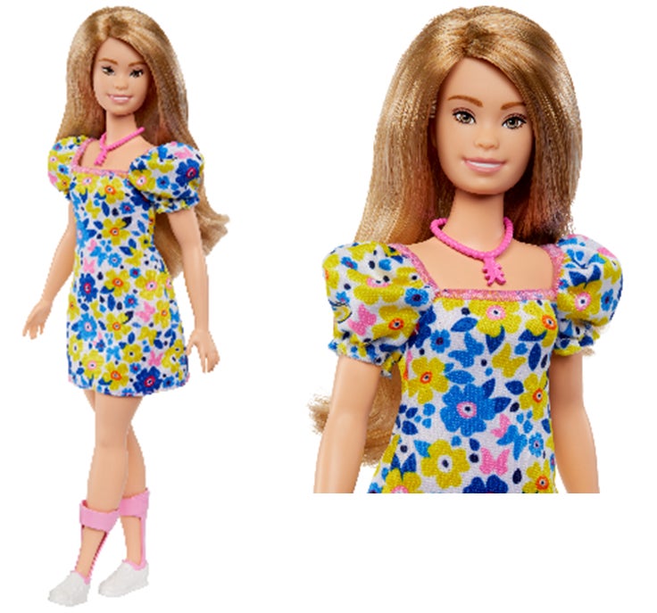 初のダウン症のバービードールは、National Down Syndrome Society(全米ダウン症協会)と協力してデザインされました。ダウン症の女性をよりよく表現するために、顔は丸みを帯び、耳は小さく、鼻筋は平で、目はアーモンド型に少し傾いている特徴をドールに取り入れています。また、ダウン症のシンボルである蝶や、ダウン症の認知度を表すブルーとイエローの配色など、ワンピースのいたるところに取り入れられています。ピンクのペンダントネックレスには、ダウン症の人が持つ21番染色体を表す3本の矢印が描かれており、外を向いていることから、立ち上がり、前進することを表現しています。さらに、歩行をサポートするピンクの足首用装具(AFO)はスタイリッシュなファッションに完璧にマッチしています。