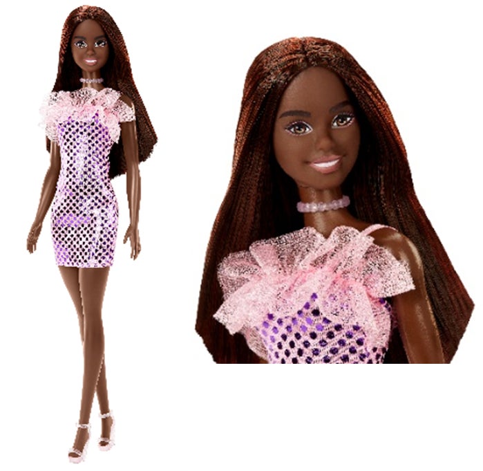 胸元のフリルが特徴のメタリックなピンクのミニドレスを着たダークヘアのバービーです。ぴったりと体にそったシルエットのドレスは、ピンクのスパンコールや胸元のフリルによって華やかさを演出しています。ピンクのハイヒールとチョーカーネックレスでファッションに統一感を持たせています。