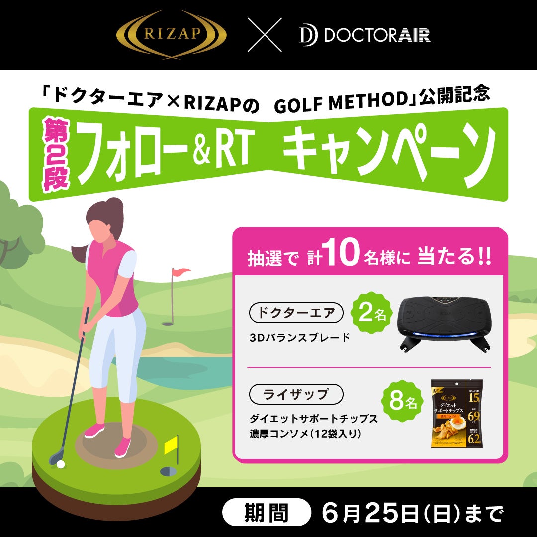 全国約4,000店で取り扱われているトータルボディケアブランド『ドクターエア』では、『RIZAP』共同開発の【3Dバランスブレード】を使用したスペシャルメソッドを公開。今回のスペシャルメソッドは、トータルサポートで結果にコミットするパーソナルゴルフジム『RIZAP GOLF』監修で、“スコアアップ”したいと思っているゴルファー必見の内容となっております。 また公開を記念し、Twitterキャンペーンと【3Dバランスブレード】の購入特典キャンペーンを実施することをお知らせいたします。