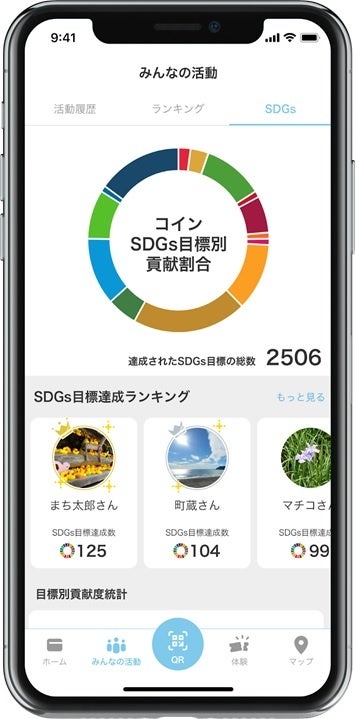 参加頻度でボーナスポイントが付与されたり、ポイントが増えるとレベルアップしたりと、ゲームのように楽しみながら、自然と地域活動に参加する機会を創出します。後からまちのコインの「活動履歴」をみることで、自分の行動がどのSDGsのゴールにつながっているか振り返ることもでき、SDGsの自分ごと化にもつながります。