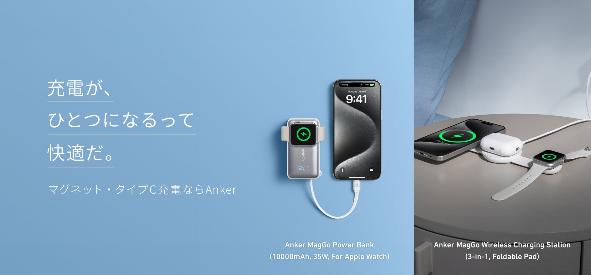米国・日本・欧州を中心にデジタル関連製品でトップクラスの販売実績を誇るAnkerグループの日本法人、アンカー・ジャパン株式会社(本社:東京都千代田区、代表取締役CEO:猿渡 歩)は、世界No.1モバイル充電ブランド(※)の「Anker」において最新のiPhone 16シリーズやApple Watchの充電に最適な「Anker MagGo Power Bank(10000mAh, 35W, For Apple Watch)」および「Anker MagGo Wireless Charging Station(3-in-1, Foldable Pad)」等の10製品を2024年9月10日(火)よりAnker Japan 公式オンラインストア(特設ページ:https://www.ankerjapan.com/pages/anker-maggo-typec-2024)、直営店Anker Store、総合オンラインストアAmazon.co.jp(製品ページ:https://www.amazon.co.jp/dp/B0D7TQ5G34)、楽天市場(製品ページ:https://item.rakuten.co.jp/anker/a1657/)および一部家電量販店等にて予約販売を開始致します(※1)。