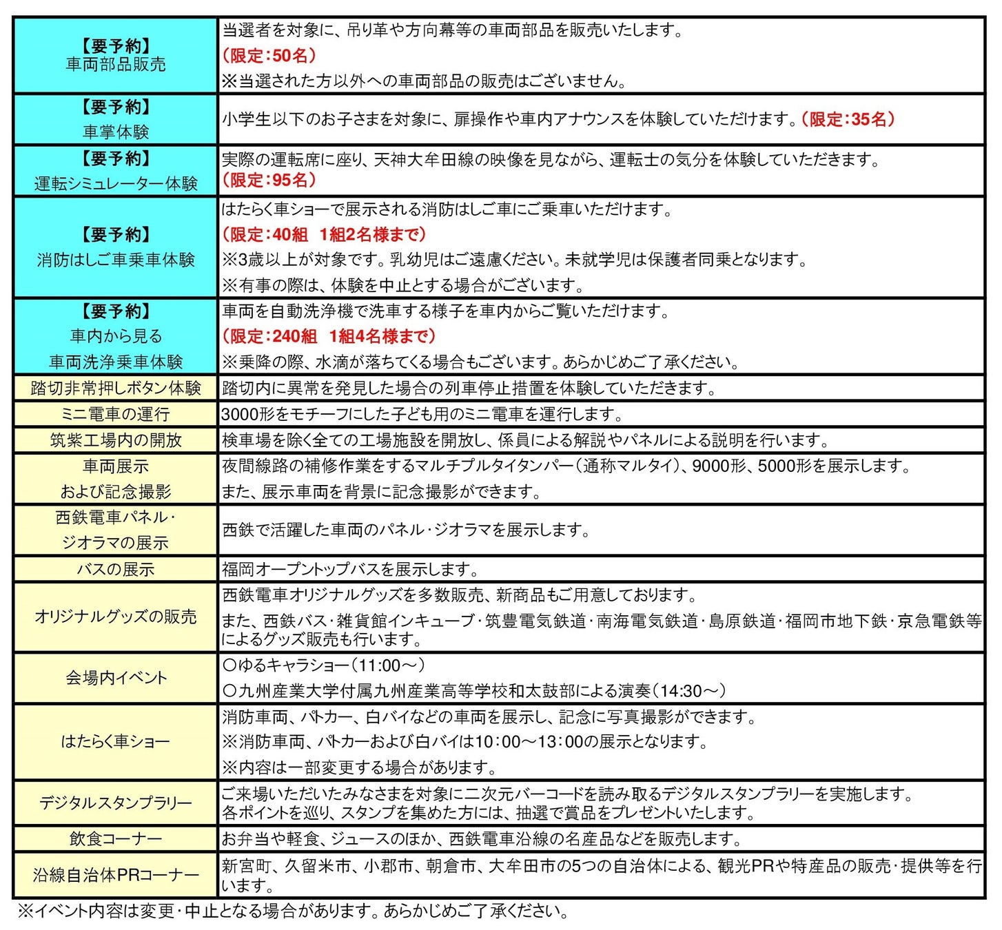 車両部品販売、車掌体験、運転シミュレーター体験、消防はしご車乗車体験、車両洗浄乗車体験については事前予約が必要です。