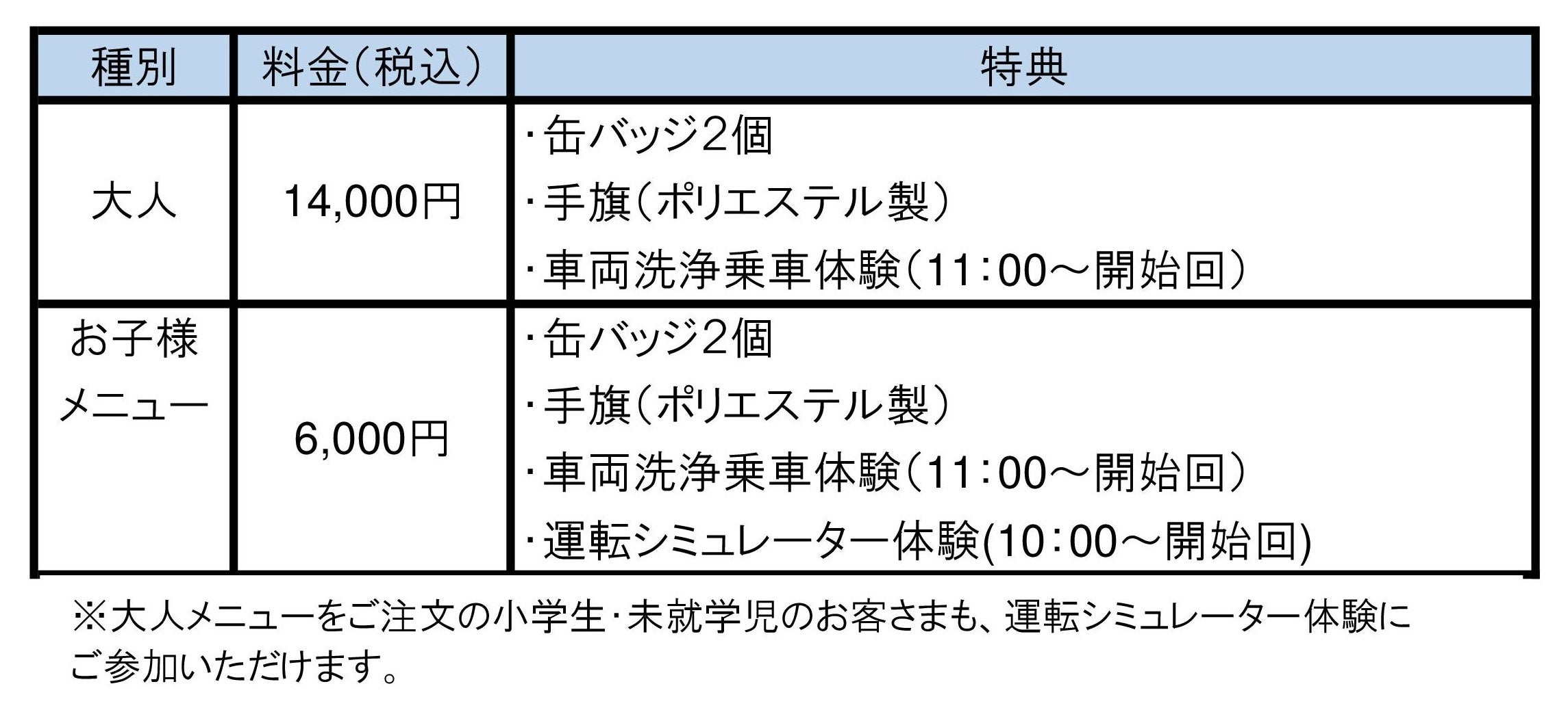 レイトランチのコースメニューに加え、にしてつ電車まつりで「予約抽選」となっている一部体験イベントに必ずご参加いただけるとともに、当コースオリジナルグッズ(非売品)をセットにしたこの日だけの特別コースです。