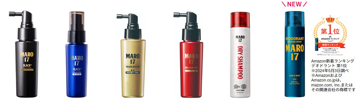 (左から)MARO17ブラックプラスシリーズ コラーゲン配合(保湿)ショット/MARO17 ブラックプラスシリーズエッセンス/MARO17 薬用発毛促進ブースター【医薬部外品】(販売名:薬用ヘアエッセンスMHC)/MARO17 頭皮用エッセンス コラーゲン配合(保湿)ショット/MARO17 ドライシャンプー/MARO17 薬用デオドラントリフレッシュスプレー