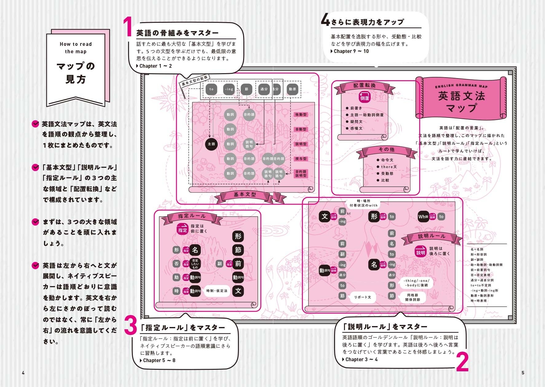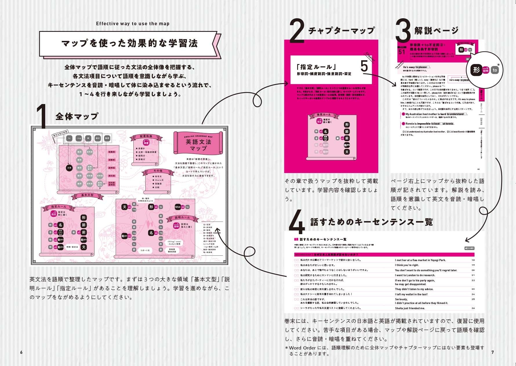 マップに描かれた語順を意識しながら、文法解説を読み、英文を音読・暗唱してください。英文法の世界の歩みを進めるごとに、ネイティブスピーカーと同じ意識で英文を作れるようになる自分に気づくはずです。