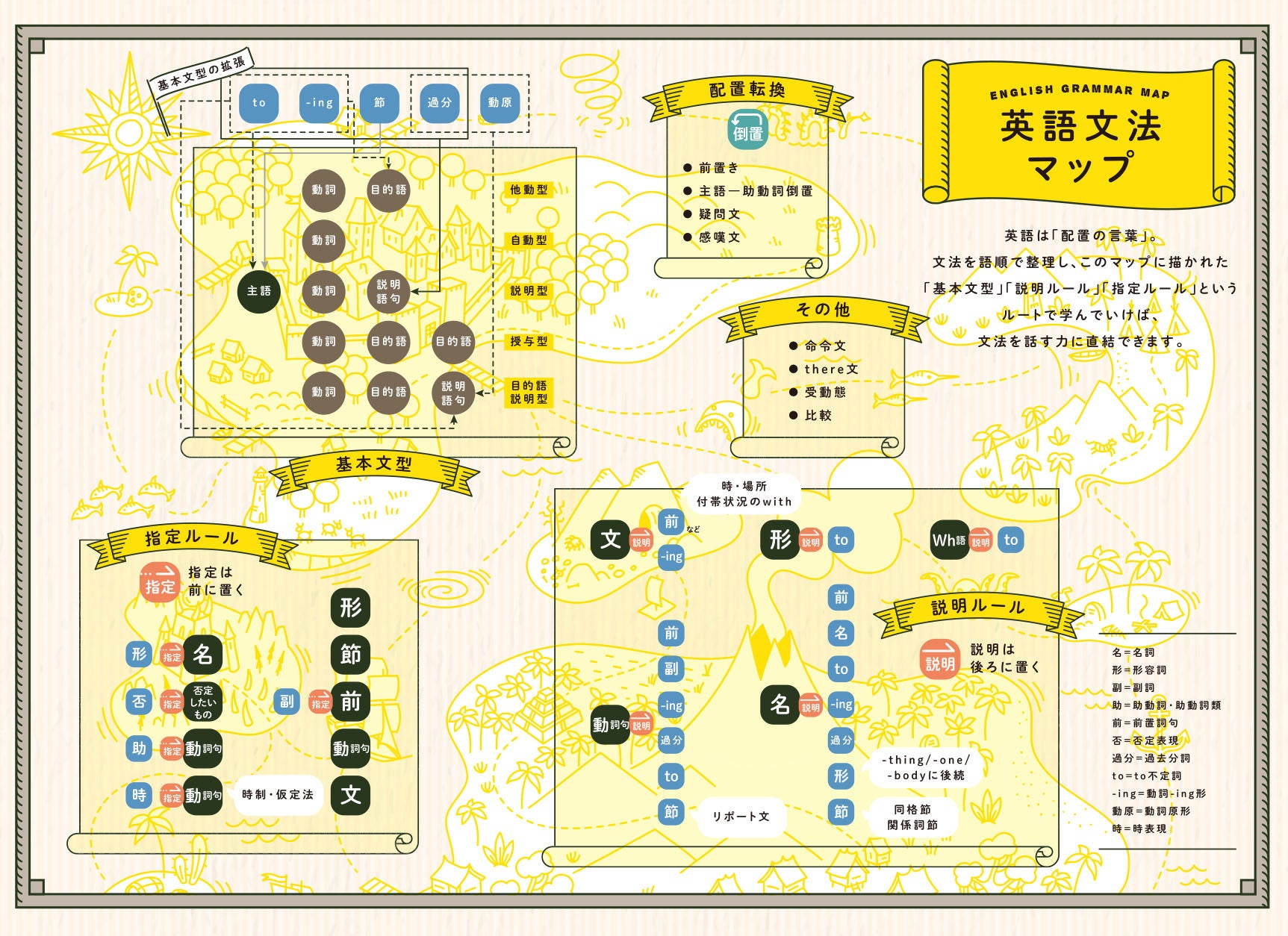 英文法を語順で整理することで見えてくるのは、「基本文型」「説明ルール」「指定ルール」の たった3つ大きな領域。