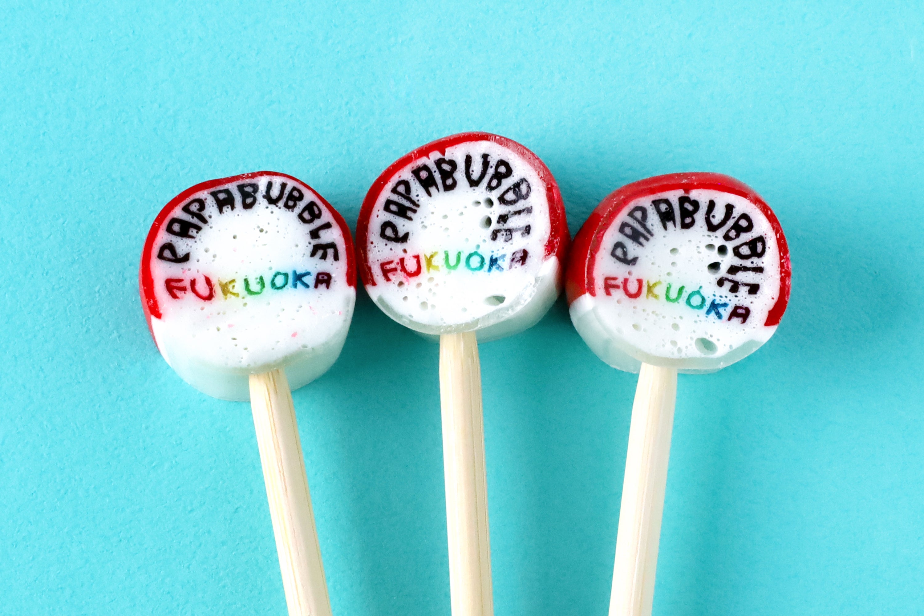 紅白を基調に「PAPABUBBLE」とレインボーカラーの「FUKUOKA」の文字を組み込んだ、高度な技術を要する特別デザイン。紅白のお祝いカラーで仕上げた、ここでしか手に入らないキャンディで一緒にお祝いください。
