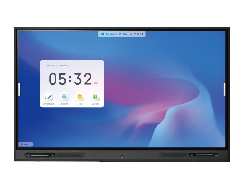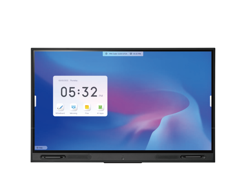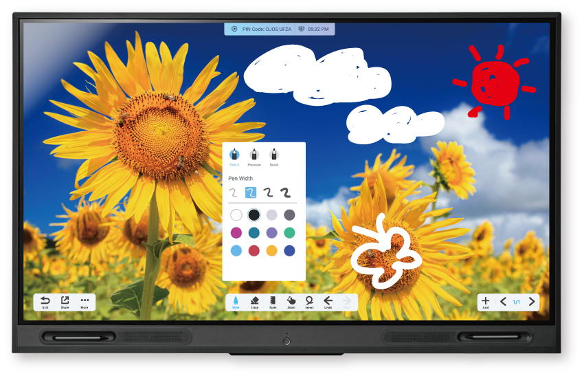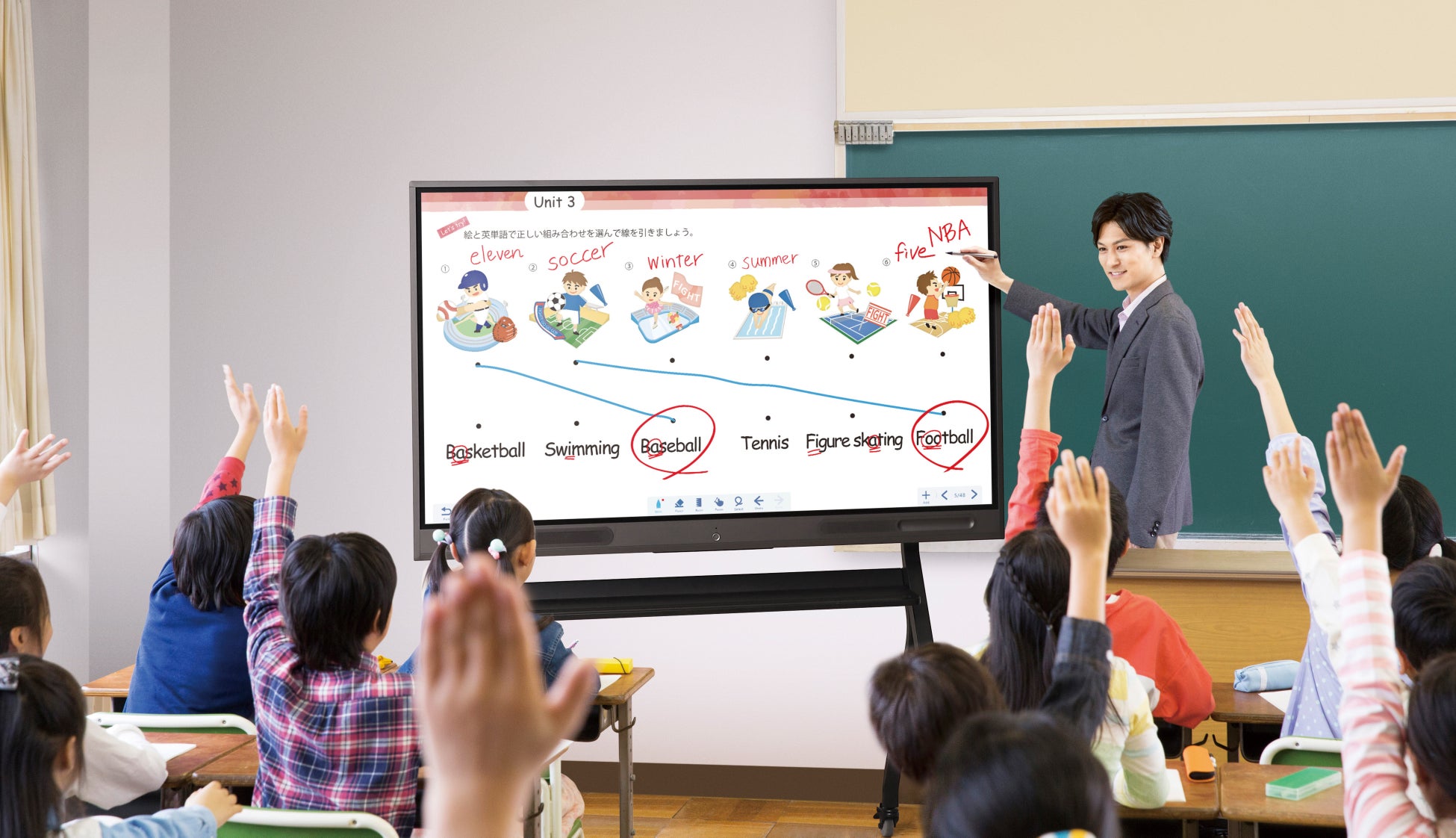 電子黒板は65型と75型の2機種で、4K対応の高精細ディスプレイにより映像などのコンテンツを鮮明に表示でき、シンプルなデザインのため、誰でも直感的に操作できます。また、外部機器を通じて画像や映像を表示したり、メジャーや図形ツールなどの機能を搭載しているため、効率的で創造的な授業を行えます。さらにパソコンやタブレットを接続することで(※1)画面の共有や相互操作も簡単に行えるほか、最大9端末の画面を同時に表示するなど、電子黒板の画面を生徒の端末に共有することができるため、グループ学習や双方向学習にも適しています。