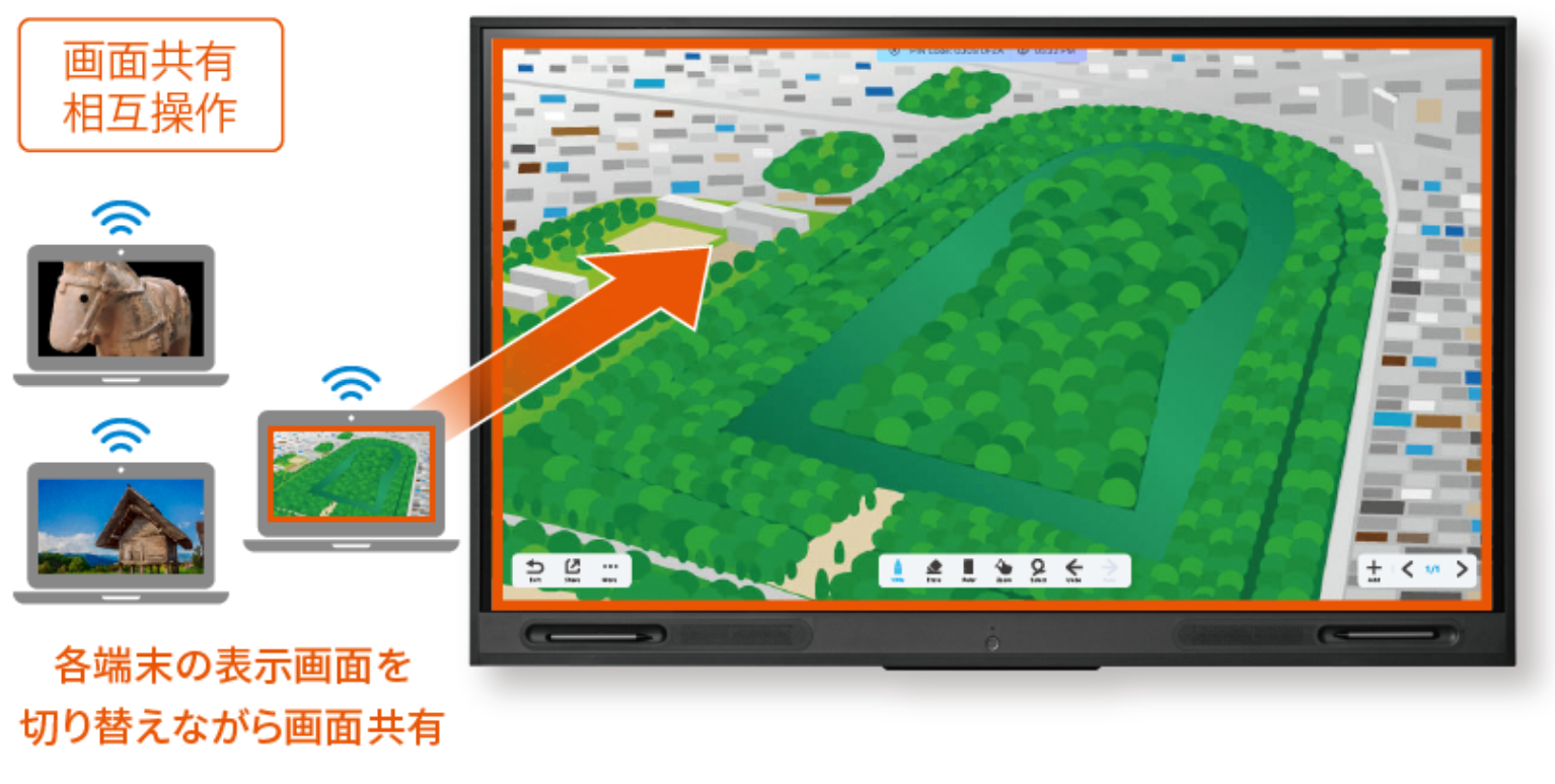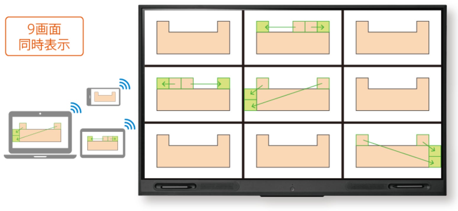 専用アプリ「EShere」(※3)や、オプションの「ミラーリングキー」を使用することで、パソコンやタブレット、スマートフォンなどの端末をワイヤレスで電子黒板に接続し、ワンタッチで画面共有や相互操作が可能です。最大9端末の画面を同時に表示できるため、生徒の考えを共有しながら比較し、理解を深めるサポートをします。また、電子黒板で表示された画面を生徒の端末へ共有し、各端末上で書き込むことも可能なので、グループ学習や双方向型学習にも適しています。(※4)