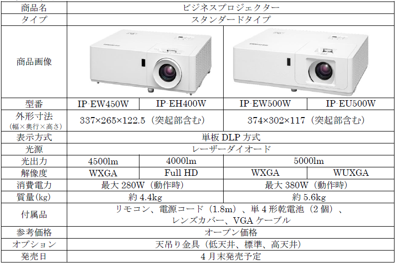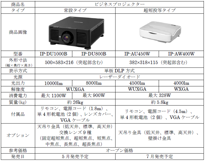 プロジェクターは、大会議室やホールなどの広い空間に適した常設タイプ2機種、オフィスを想定したスタンダードタイプ4機種、教室など限られたスペースでの大画面投写に対応した超短投写タイプ2機種の計8機種を用意します。