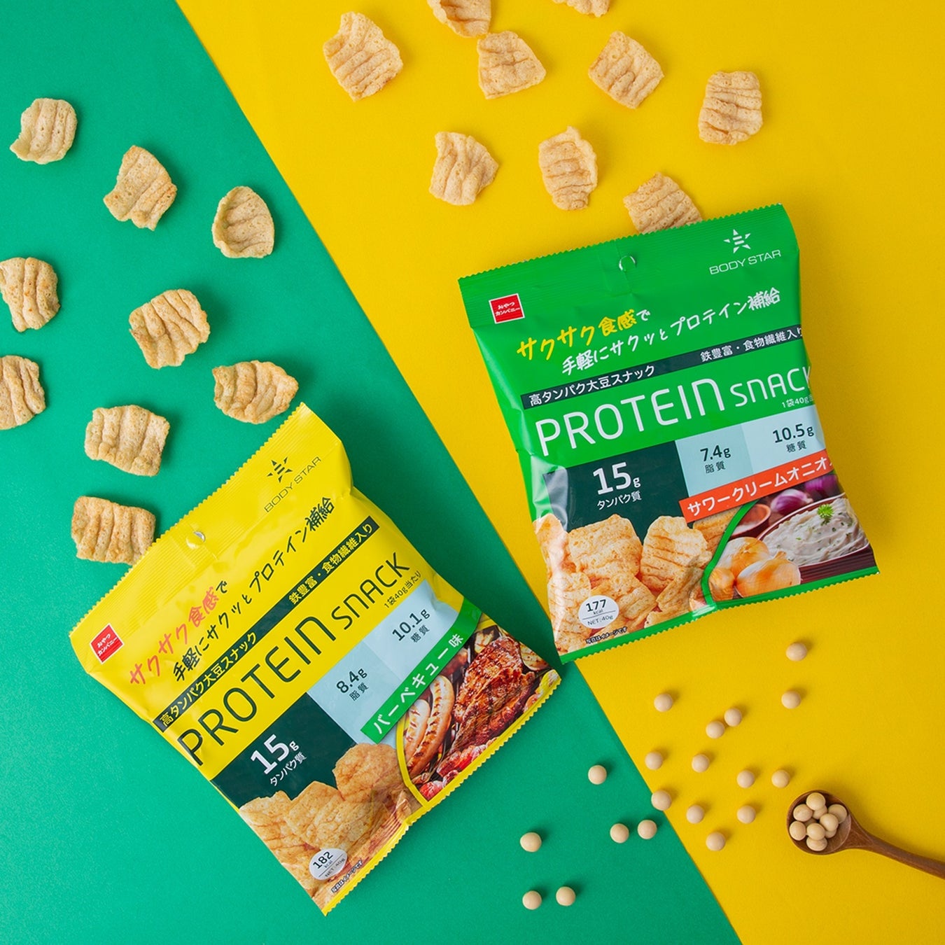 ユニークで美味しい“おやつ”を提供し続けてきたおやつカンパニーのスナック菓子製造ノウハウを活かし、楽しみながらも手軽に栄養補給ができる新ブランド『BODY STAR』として「タンパク質」に着目した商品を展開。おやつ感覚ながら“数値で語れる”量の提供をコンセプトに展開する『BODY STAR プロテインスナック』は、大豆を使った生地をスナック菓子らしい味付けで仕上げることで、1袋あたりタンパク質20g・食物繊維4gの効率的な摂取とスナック菓子らしい美味しさの両立を実現。カリカリッとしたハードな食感としっかりとした味付けで、無理なく美味しく楽しみながらカラダメンテができる、これまでにない商品として2021年3月に登場しました。