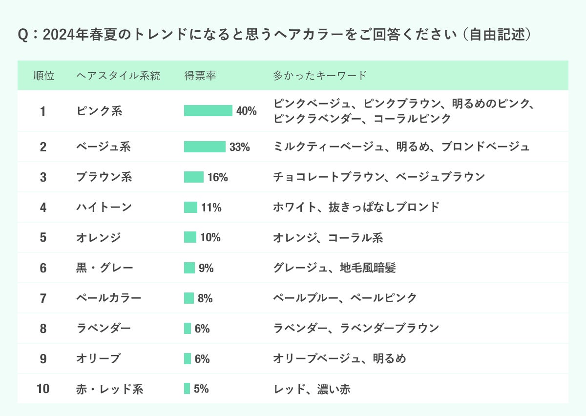 【2024年春夏】現役美容師186名に調査!「トレンドヘアカラー」「トレンドヘアスタイル」 明るく透明感のある“ペール系カラー”や多様化する“レイヤースタイル”に注目