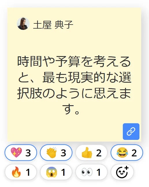 付箋にリアクションを追加する機能は、付箋に対して「ハート」や「いいね」など絵文字のリアクションをワンクリックで簡単に追加できる機能です。言葉での複雑なコメントを書くことなく、意見や感情を瞬時に共有することが可能です。特にオンライン会議やディスカッションでは、意見が偏りがちだったり、発言のタイミングが難しいといった課題があります。この機能を使えば、絵文字リアクションが付箋にアイコンとして表示されるため、全体の意見傾向を視覚的に把握でき、議論をスムーズに進められます。さらにこの機能はリアルタイムで更新されるので、チーム全員が即座にリアクションを確認できます。これにより迅速な意思表明が促進され、チームワークマネジメントの実践をサポートします。