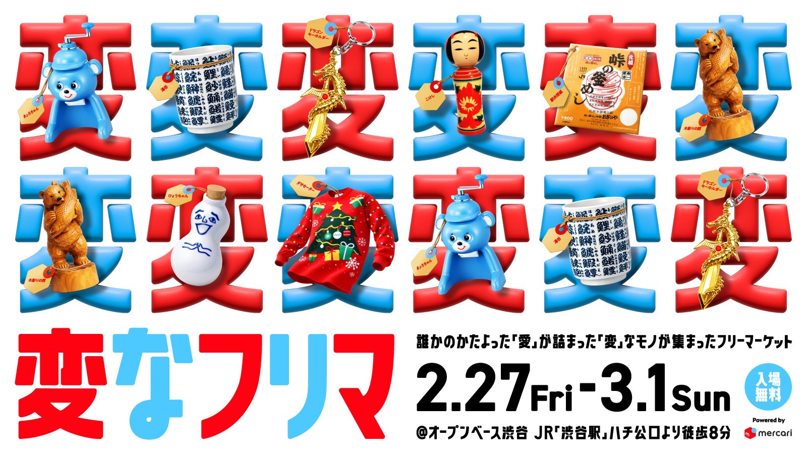 株式会社メルカリ(以下、メルカリ)は、2026年2月27日(金)から3月1日(日)までの3日間、東京・渋谷のOPENBASE SHIBUYAにて、体験型フリーマーケットイベント「変なフリマ」を開催します。本イベントでは、約200点の「偏愛アイテム」が集結。開催を記念した現役高校生アーティストMON7Aさんによる限定フリーマーケットの他、見るだけでなく、体験・購入もできる参加型没入型企画を展開します。展示・体験・購入が一体となった構成で、検索では出会いにくい“誰かが愛しすぎたモノ”との新たな接点を創出します。なお、本イベントで掲げる“変”とは、一般的に言われる奇抜さや違和感ではなく、特定のモノやジャンルにおいて、誰かが愛しすぎた結果として生まれた”愛”の形であると定義しています。