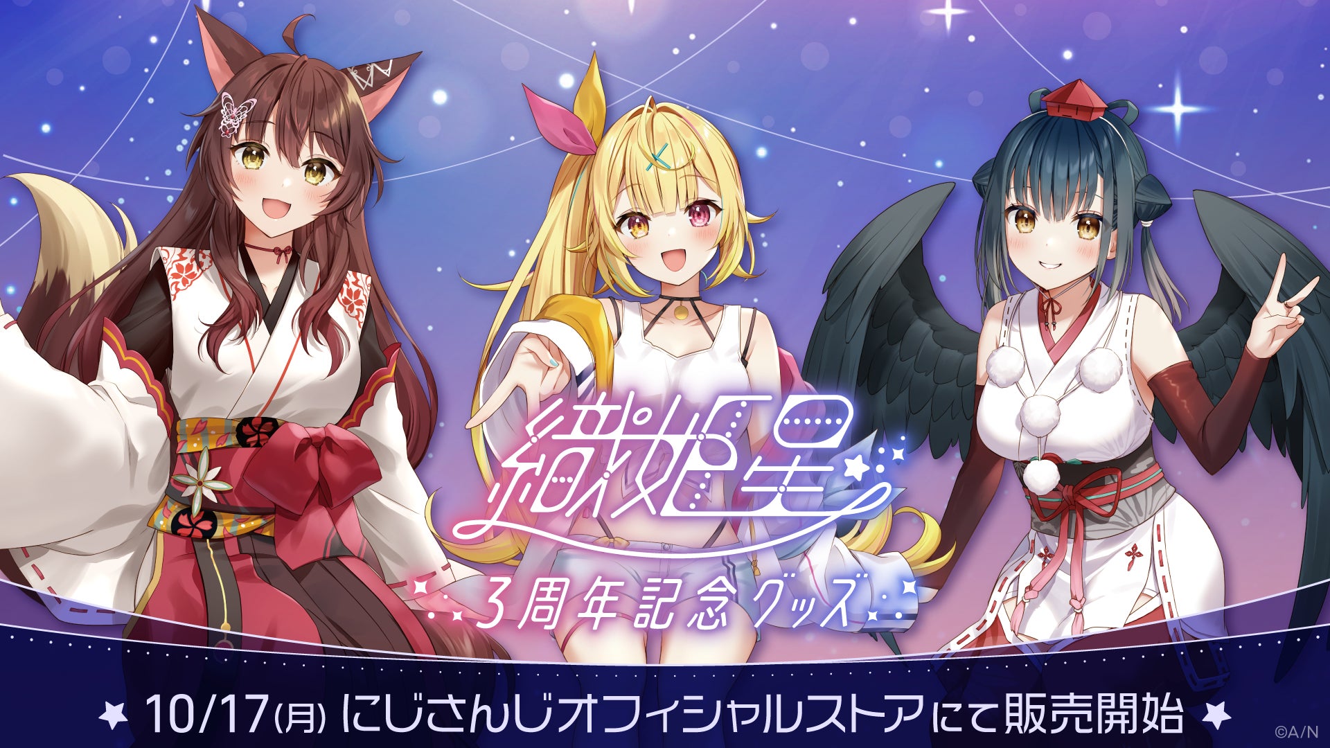 にじさんじライバーのフミ、星川サラ、山神カルタのユニット「織姫星」の3周年を記念したグッズが登場!2022年10月17日(月)17時より、にじさんじオフィシャルストア(https://shop.nijisanji.jp/)で販売開始いたします。