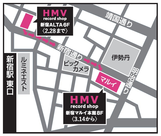 このたび、「HMV record shop 新宿ALTA」は、2025年3月14日(金)に新宿東口 新宿マルイ 本館8階に移転し、「HMV record shop 新宿」としてリニューアルオープンいたします。