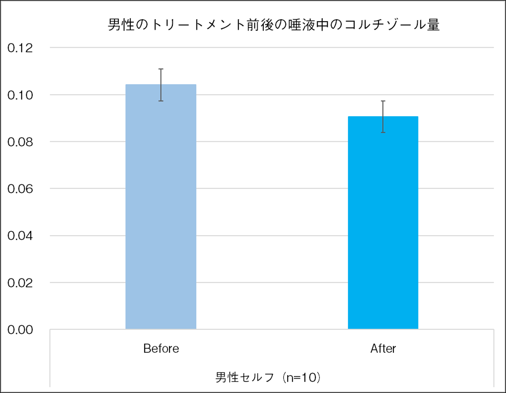20~50歳の男性10名を対象に、「幸せハンド美トリート」を自分で(セルフで)体験いただき、ストレスホルモンであるコルチゾール量の変化と心身の状態の変化を調査。