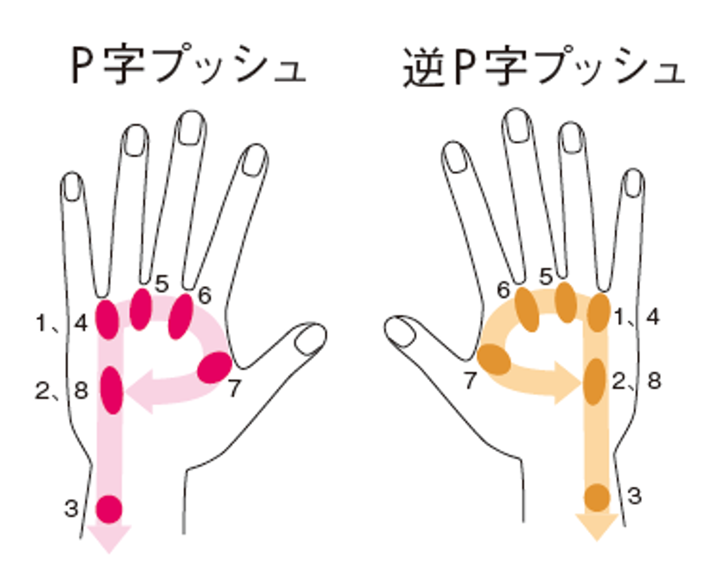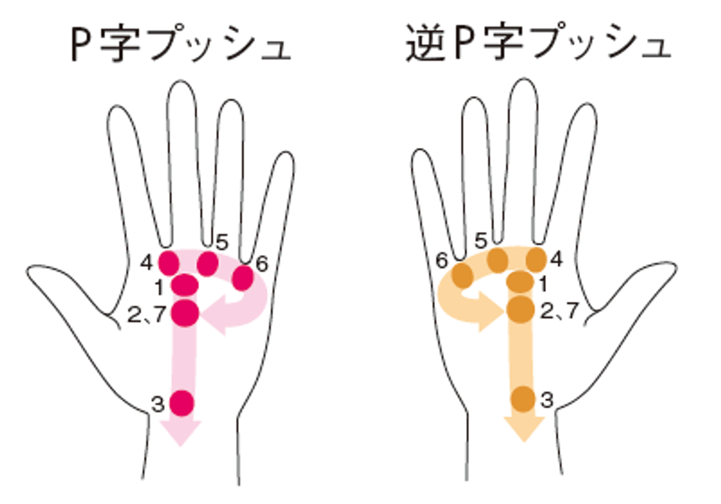 [1]手のひらに「P」を描きながら押し、炎症を鎮めて解毒を促し、リンパと血液を整える