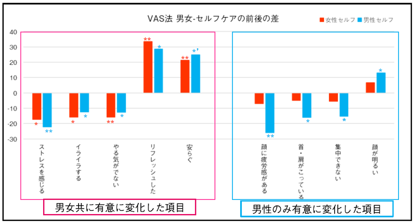 また、マイナスの項目「ストレスを感じる」「イライラする」「やる気が出ない」などはトリートメント後に男女ともに減少し、プラスの項目「リフレッシュした」「安らぐ」などはともに増加した。