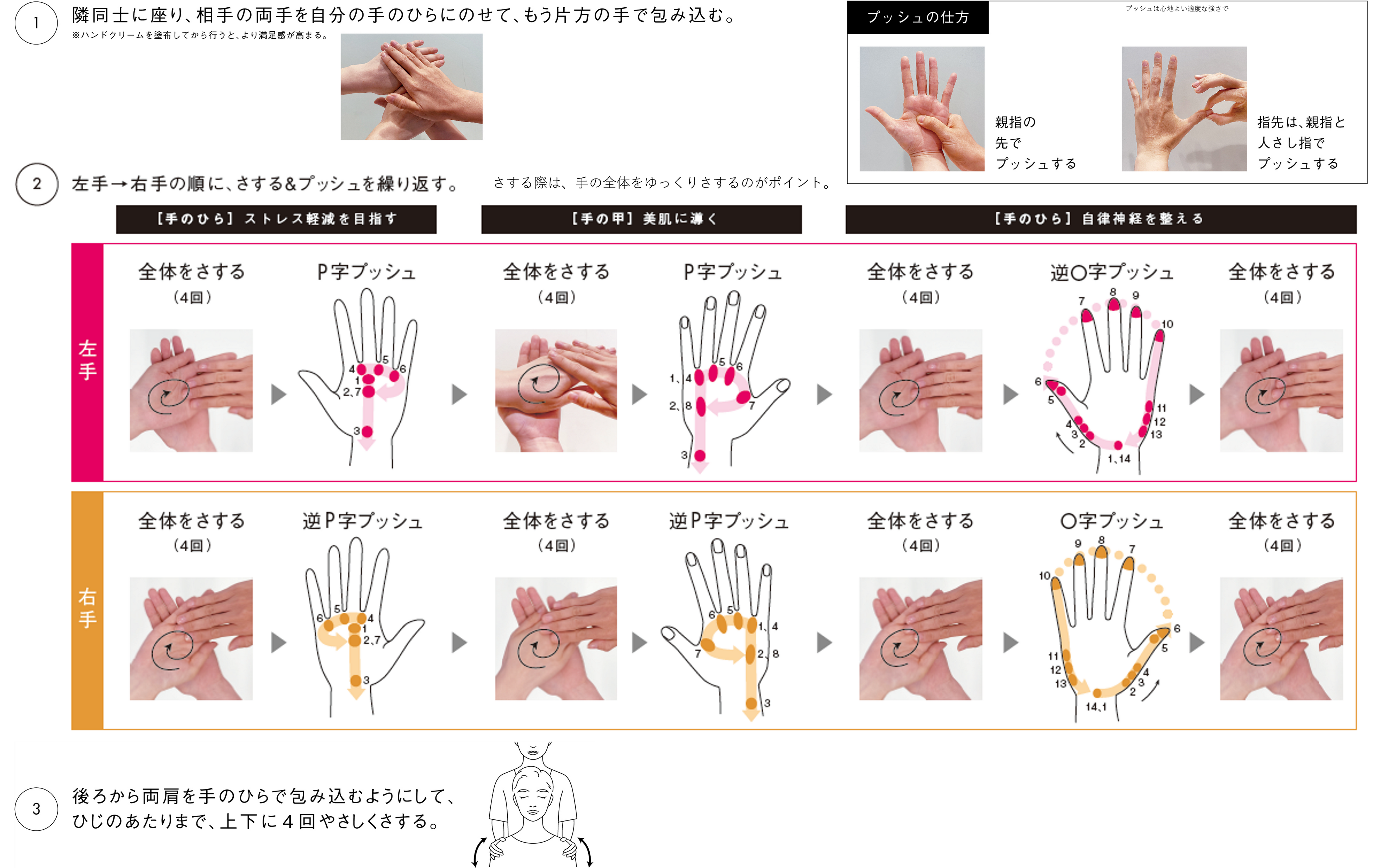 社団法人手のひらデトックス協会代表理事 足利 仁先生の東洋思想に基づいた、手のひらの反射区を「押す」メソッドと、ポーラが長年行ってきたハンドトリートメントの「さする」ケアを掛け合わせた、独自開発の手技。どなたでも簡単に試せるハンドケアで、日々のセルフケアに、また企業や学校などでのワークショップや、周りの方とのコミュニケーションの一環として、気軽に取り入れていただけます。